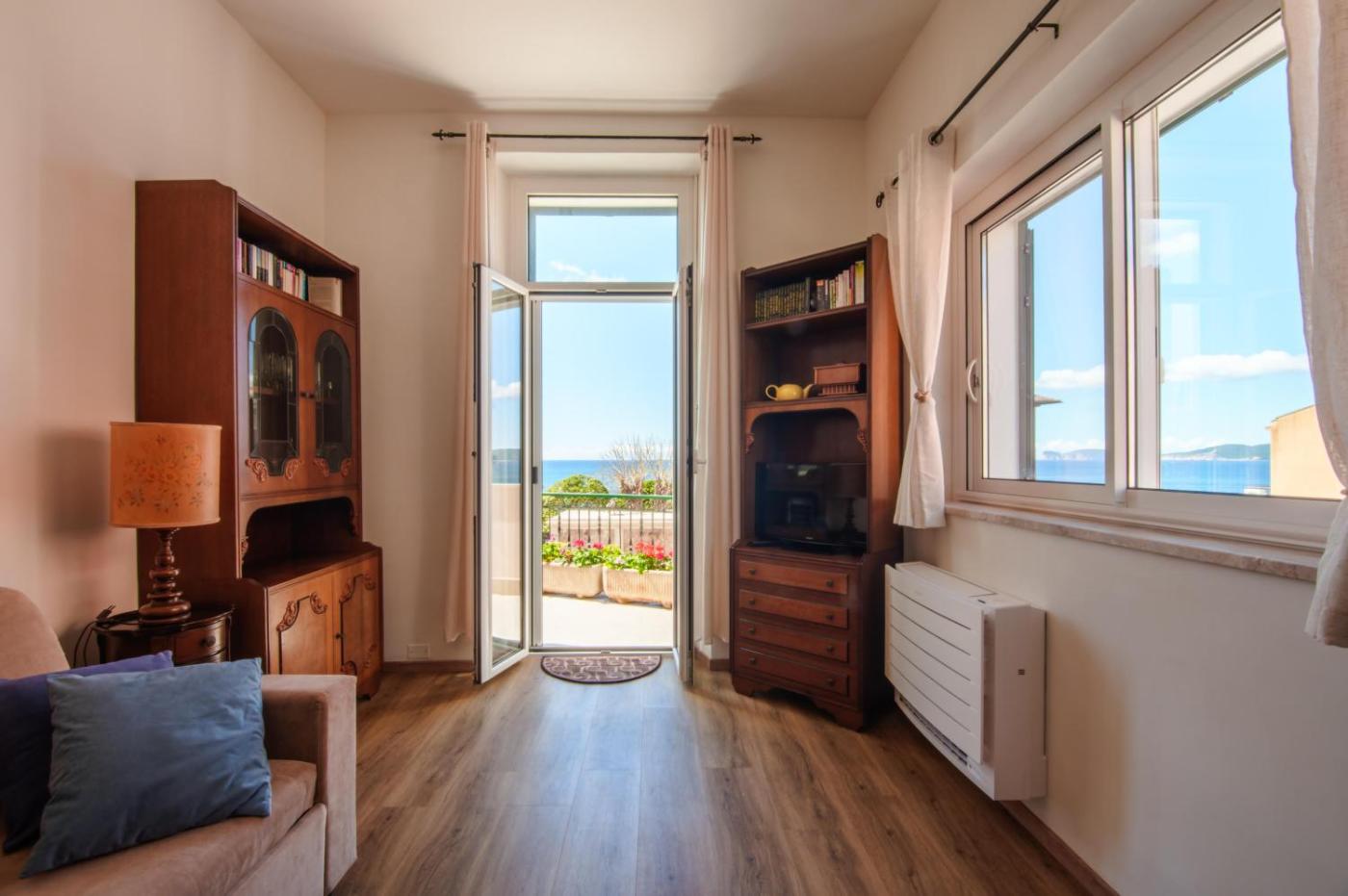 Appartamento. Featuring a private entrance, this air-conditioned apartment comprises 1 living room, 1 separate bedroom and 1 bathroom with a walk-in shower and a bidet. Meals can be prepared in the kitchen, which comes with a stovetop, a refrigerator, kitchenware and a microwave. The spacious apartment provides a washing machine, a coffee machine, a seating area as well as a terrace with sea views. The unit offers 2 beds.