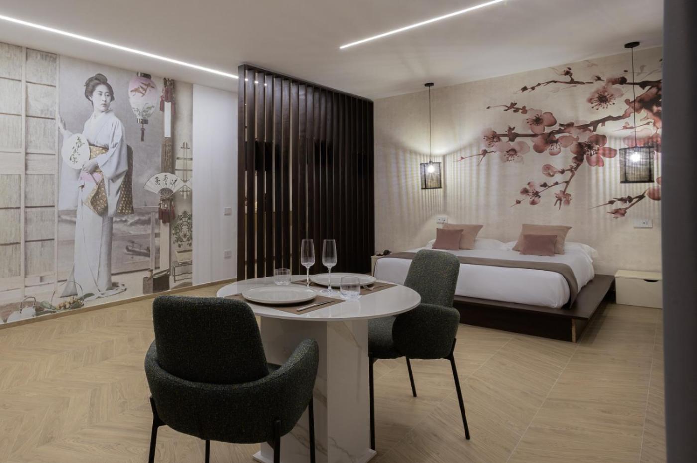Suite King con Vasca Idromassaggio. Guests will have a special experience as this suite offers a hot tub, a sauna and a fireplace. Featuring a private entrance, this spacious suite also is comprised of 1 bedroom, a seating area and 1 bathroom with a bath and a shower. Guests can make meals in the kitchenette that comes with a stovetop, a refrigerator and a tea and coffee maker. This air-conditioned suite features a dining area, a flat-screen TV with streaming services soundproof walls and a balcony. The unit offers 1 bed.