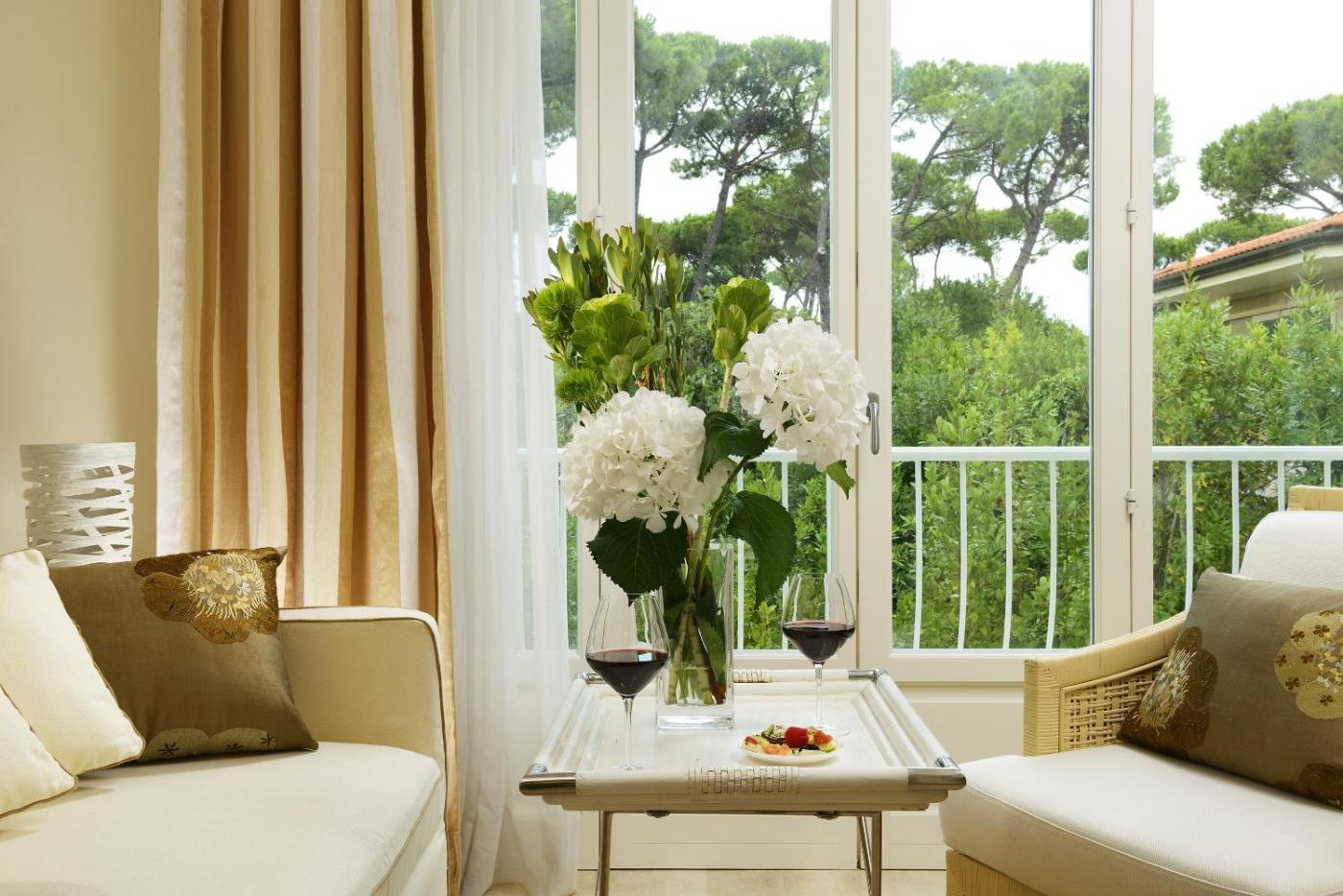 Junior Suite. Dotata di vista sulla piscina o sul giardino, questa spaziosa suite climatizzata dispone di terrazza e soggiorno con divano e poltrona. Il bagno in travertino presenta una doccia o una vasca, e alcune sistemazioni includono una vasca da bagno con idromassaggio. ;
