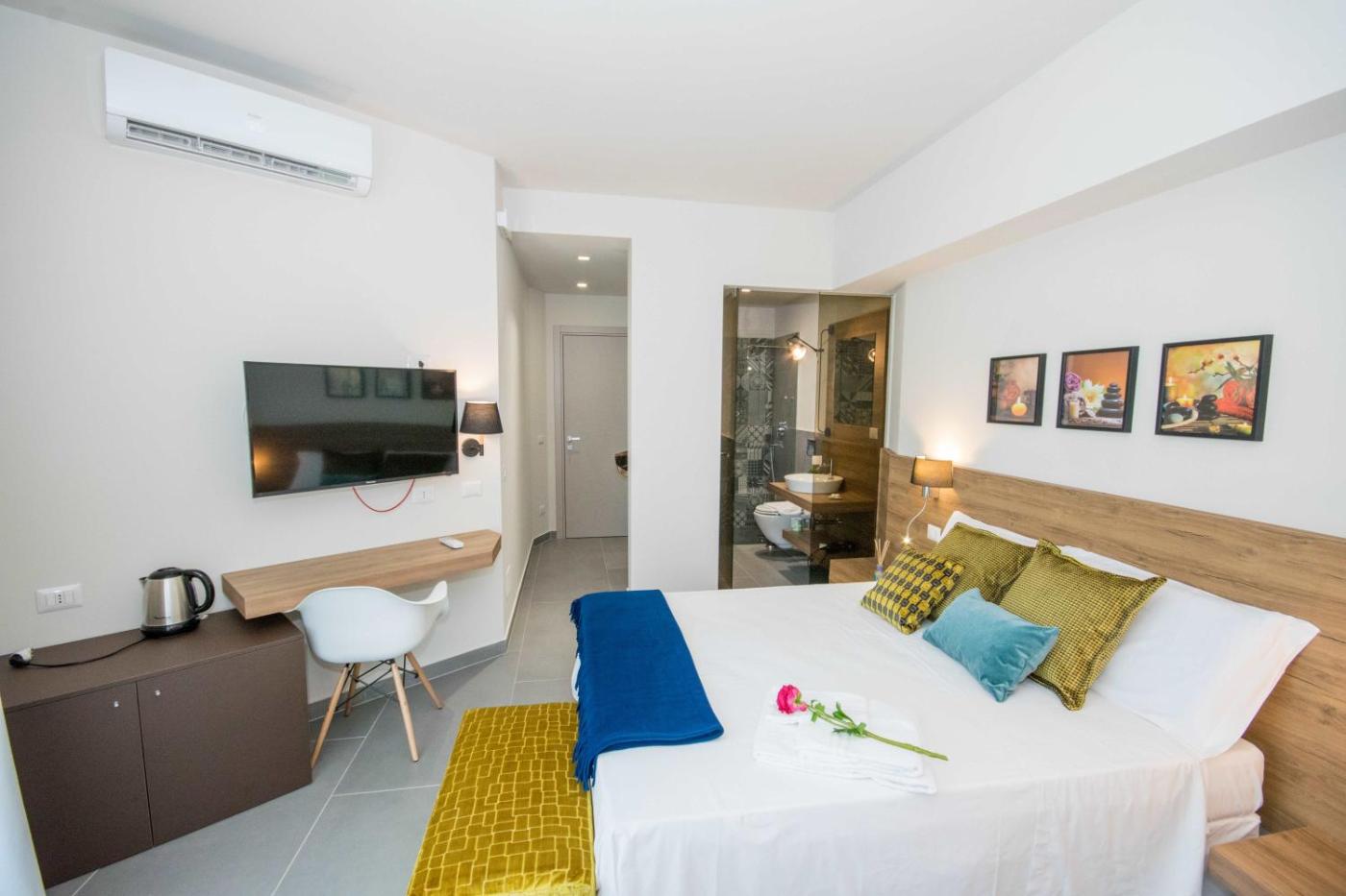 Camera Matrimoniale Deluxe con Balcone. The well-fitted kitchen has a stovetop, a refrigerator, a dishwasher and kitchenware. This air-conditioned double room is comprised of a flat-screen TV with streaming services, a private bathroom as well as a balcony with city views. The unit has 1 bed. ;