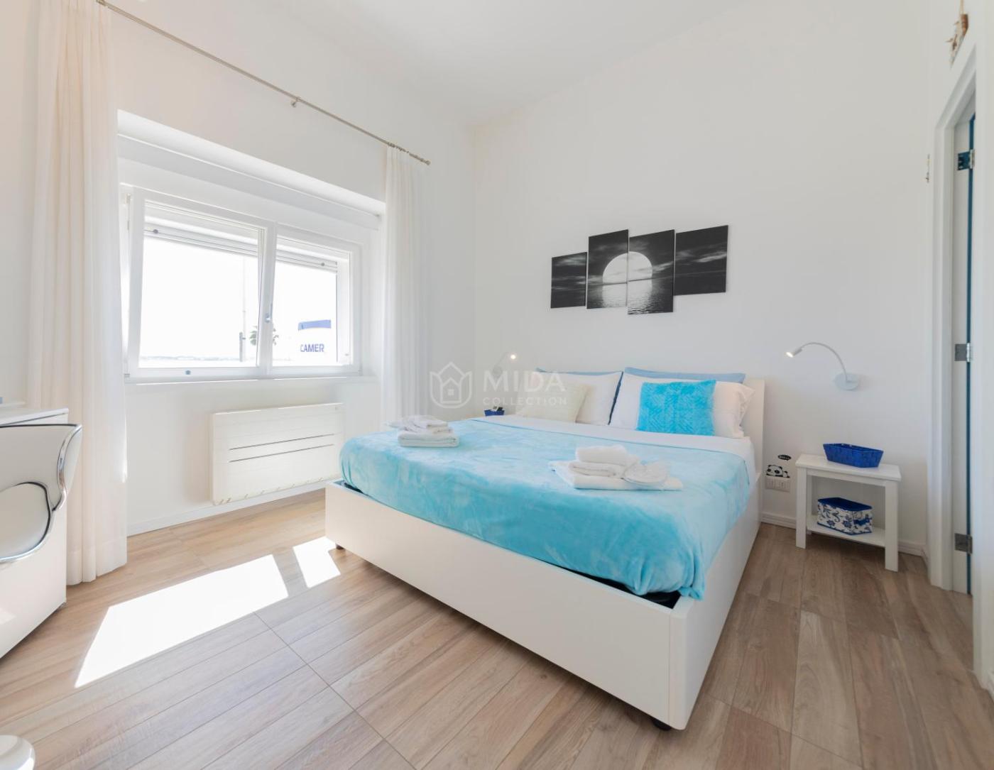 Camera Matrimoniale. La camera matrimoniale comprende un bagno privato con doccia, bidet, asciugacapelli edi cortesia. La camera matrimoniale è dotata di aria condizionata, TV a schermo piatto, ingresso privato, pareti insonorizzate, cassaforte e vista sul mare. L’alloggio presenta 1 letto. ;