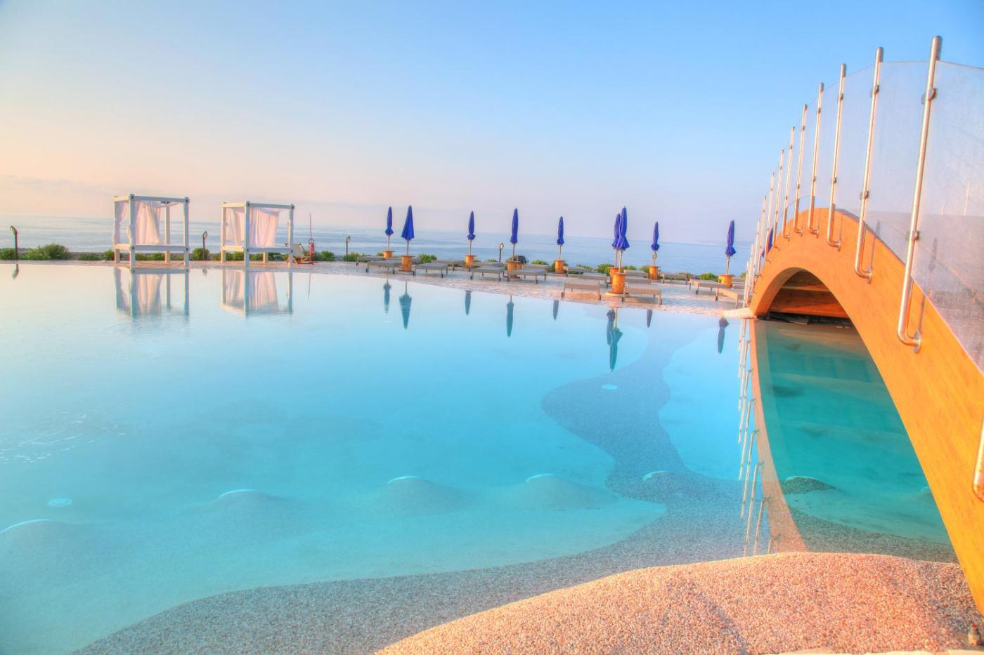 Suite Deluxe con Vista Mare. Questa suite è caratterizzata da una piscina con vista. La suite è climatizzata e dotata di un ingresso indipendente, un soggiorno, 2 camere da letto separate e un bagno con doccia e bidet. La cucina della suite, provvista di piano cottura e frigorifero, è a vostra disposizione per preparare e conservare i cibi. La spaziosa suite dispone di area salotto, zona pranzo, armadio e terrazza con vista sul mare. L’unità presenta 4 letti. ;